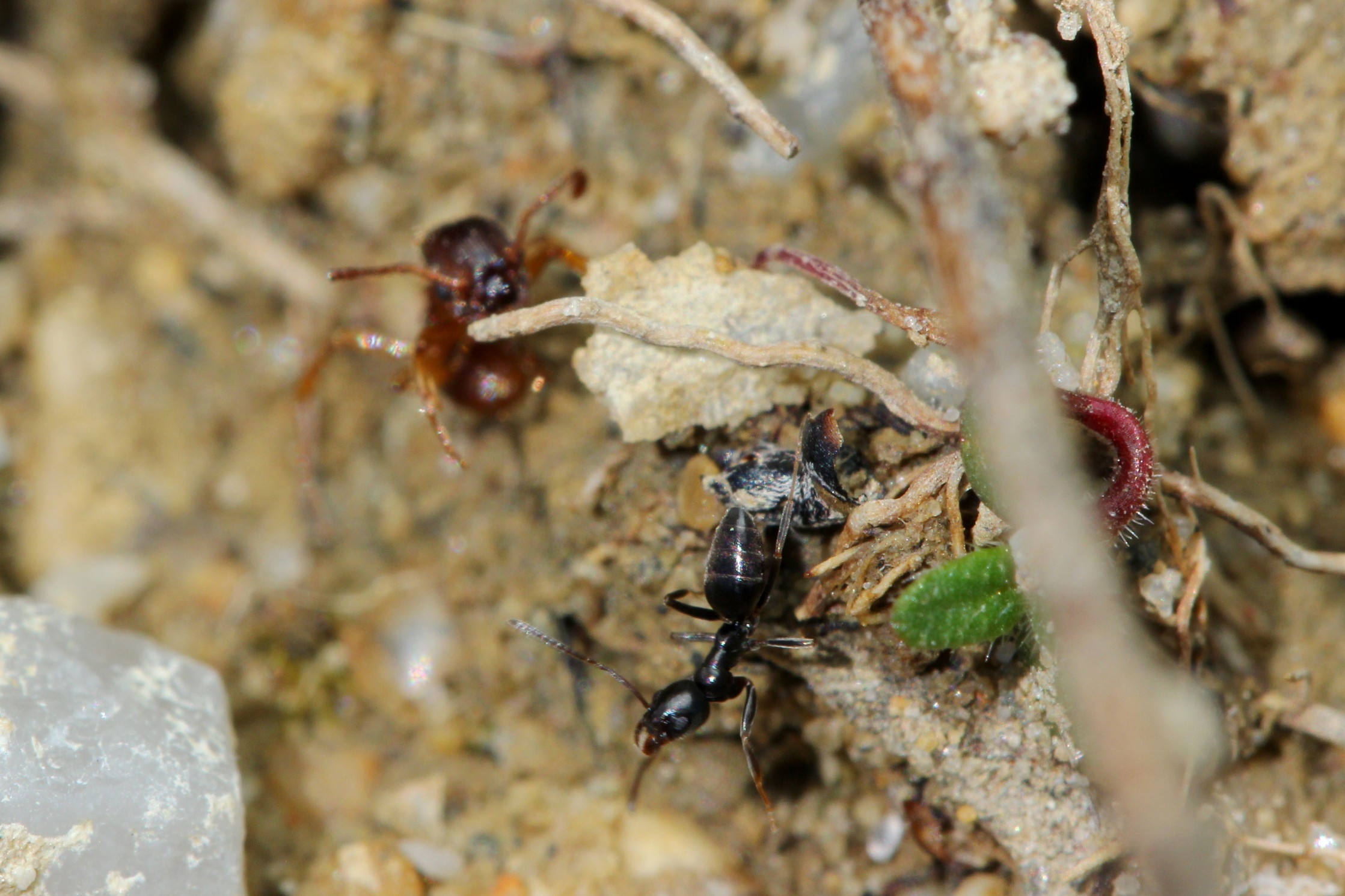 Eine Major-Arbeiterin v. Camponotus piceus ist an der Futterstelle. Eine einzelne Tapinoma nähert sich und will auch mitnaschen. Die Drohgebärden beider Kontrahenten sieht man am Foto, unmittelbar danach kam es zum Kontakt. Die Tapinoma konnte etwas Gift abstreifen u. sofort torkelt die Camponotus benommen davon. Die Tapinoma blieb siegreich und und kam anschließend zur Futterstelle!