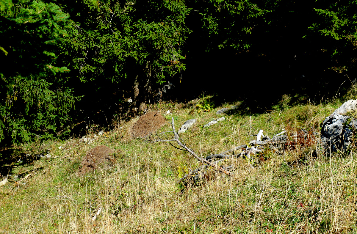 Oben bei der Bergstation schien tatsächlich die Sonne, und am Waldrand unterhalb der Bergwiesen sind etliche Hügelnester zu erkennen.